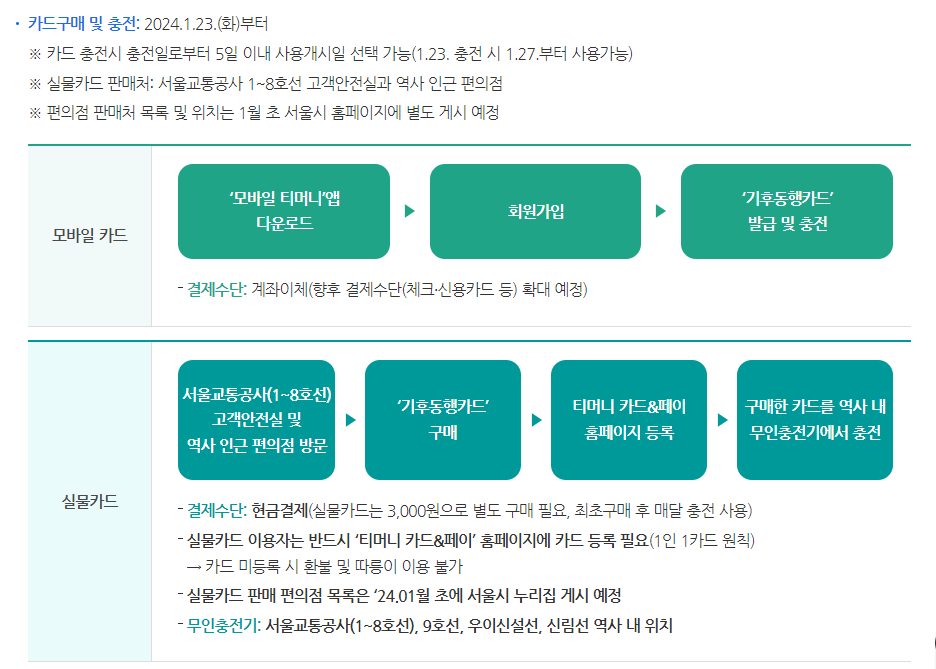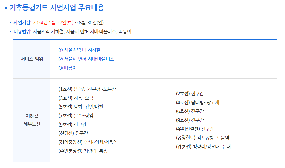 ๊ธฐํ๋ํ์นด๋(Climate Card)๋ ์์ธ์์์ ๋์ ํ ์๋ก์ด ๋์ค๊ตํต ์ด์ฉ๊ถ์ ๋๋ค. 6๋ง 5์ฒ ์์ ๋ด๊ณ ์นด๋๋ฅผ ๊ตฌ๋งคํ๋ฉด ํ ๋ฌ ๋์ ์งํ์ฒ , ์๋ด๋ฒ์ค, ๋ง์๋ฒ์ค, ๊ทธ๋ฆฌ๊ณ ๊ณต๊ณต์์ ๊ฑฐ ๋ฐ๋ฆ์ด๊น์ง ๋ฌด์ ํ์ผ๋ก ์ด์ฉํ ์ ์์ต๋๋ค.